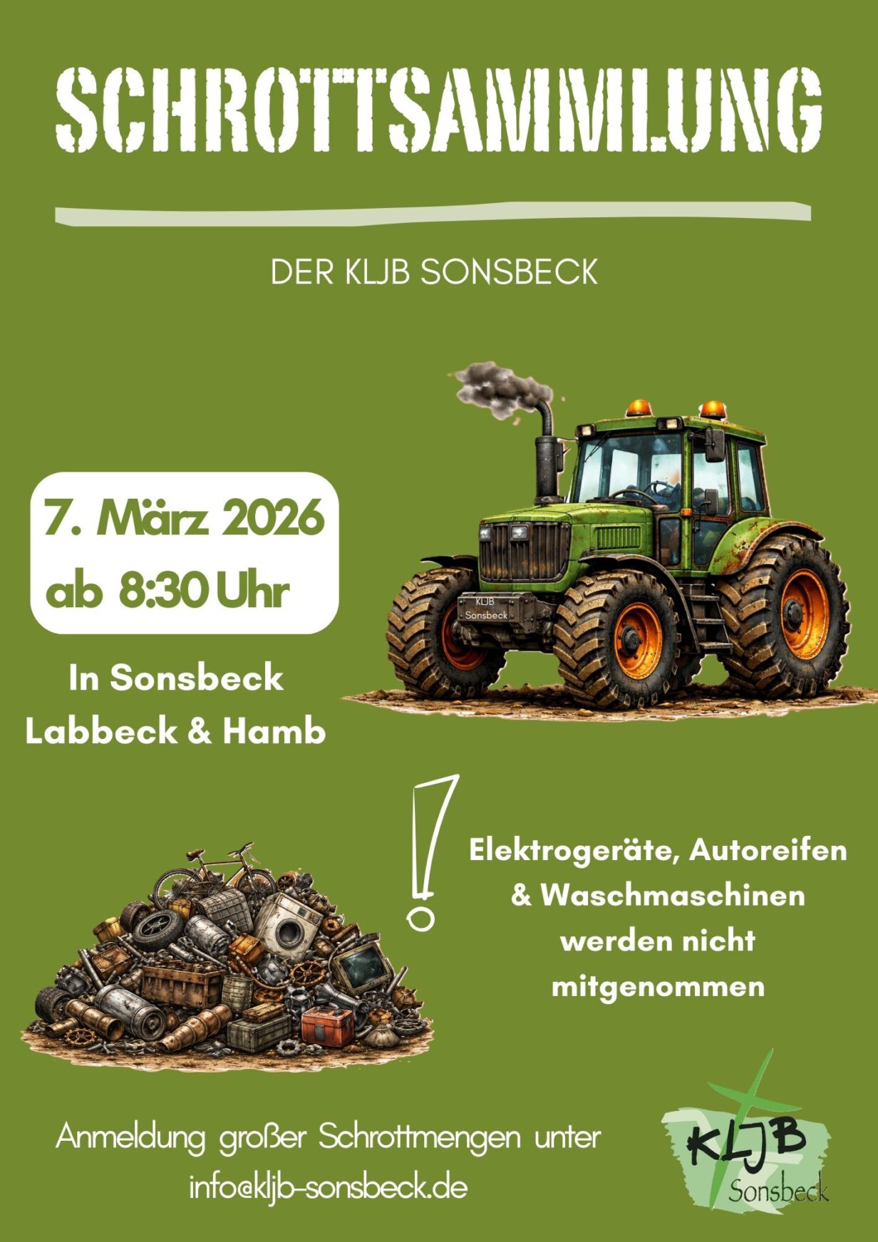 Auch im Jahr 2026 setzt die Katholische Landjugendbewegung (KLJB) Sonsbeck ihre langjährige Tradition fort: Am Samstag, 7. März 2026, sind die Mitglieder erneut mit Traktoren und Anhängern unterwegs, um in Sonsbeck, Labbeck und Hamb Schrott und Alteisen einzusammeln. Bereits ab 9 Uhr starten die Helferinnen und Helfer vom Schweinemarkt aus ihre Touren durch die Ortschaften. …