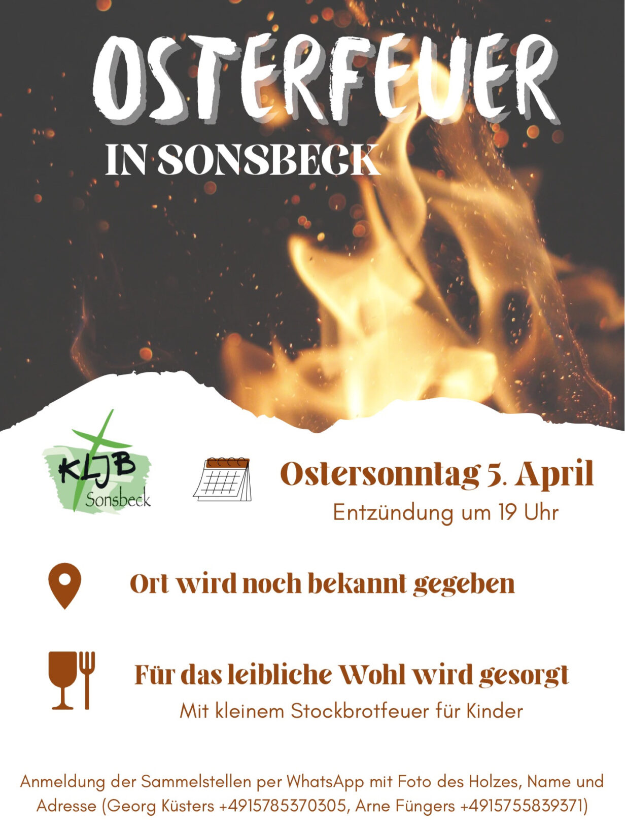 Auch in diesem Jahr organisiert die Landjugend Sonsbeck wieder das traditionelle Osterfeuer. Jeder ist eingeladen, am Ostersonntag, dem 05. April, einen gemütlichen Abend zu verbringen. Der Ort des Osterfeuers wird noch bekannt gegeben. Die Mitglieder holen das gesegnete Feuer an der Pfarrkirche St. Maria Magdalena ab, um das Osterfeuer um 19 Uhr zu entfachen. …