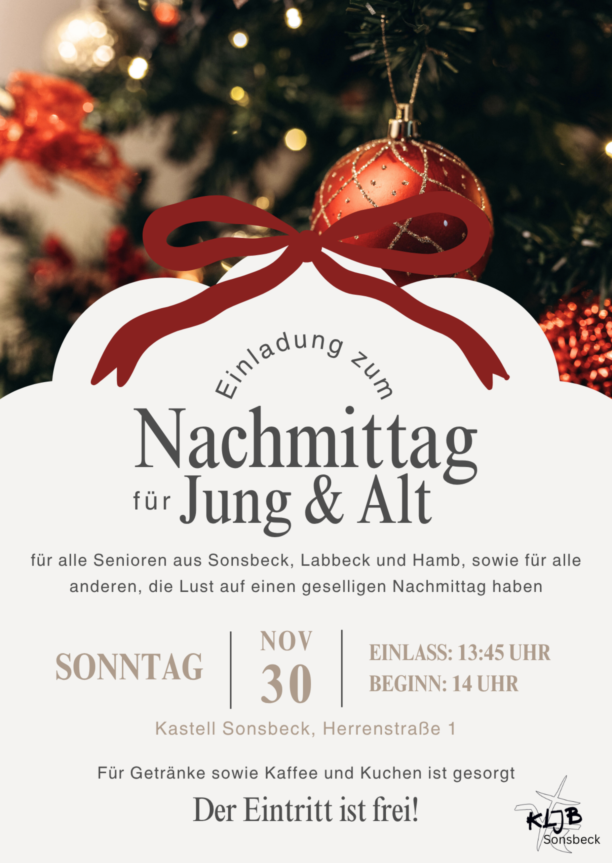 Kaffee, Kuchen und ein kunterbuntes Programm in vorweihnachtlicher Atmosphäre: Dies steht wieder auf der Tagesordnung beim traditionellen „Nachmittag für Jung und Alt“. Veranstaltet wird dieser am ersten Advent, dem 30.11.2025, von der Katholischen Landjugendbewegung (KLJB) Sonsbeck e.V. Alle Sonsbecker, Hamber und Labbecker Senioren und Seniorinnen, sowie alle, die Lust auf einen geselligen Nachmittag haben, sind …