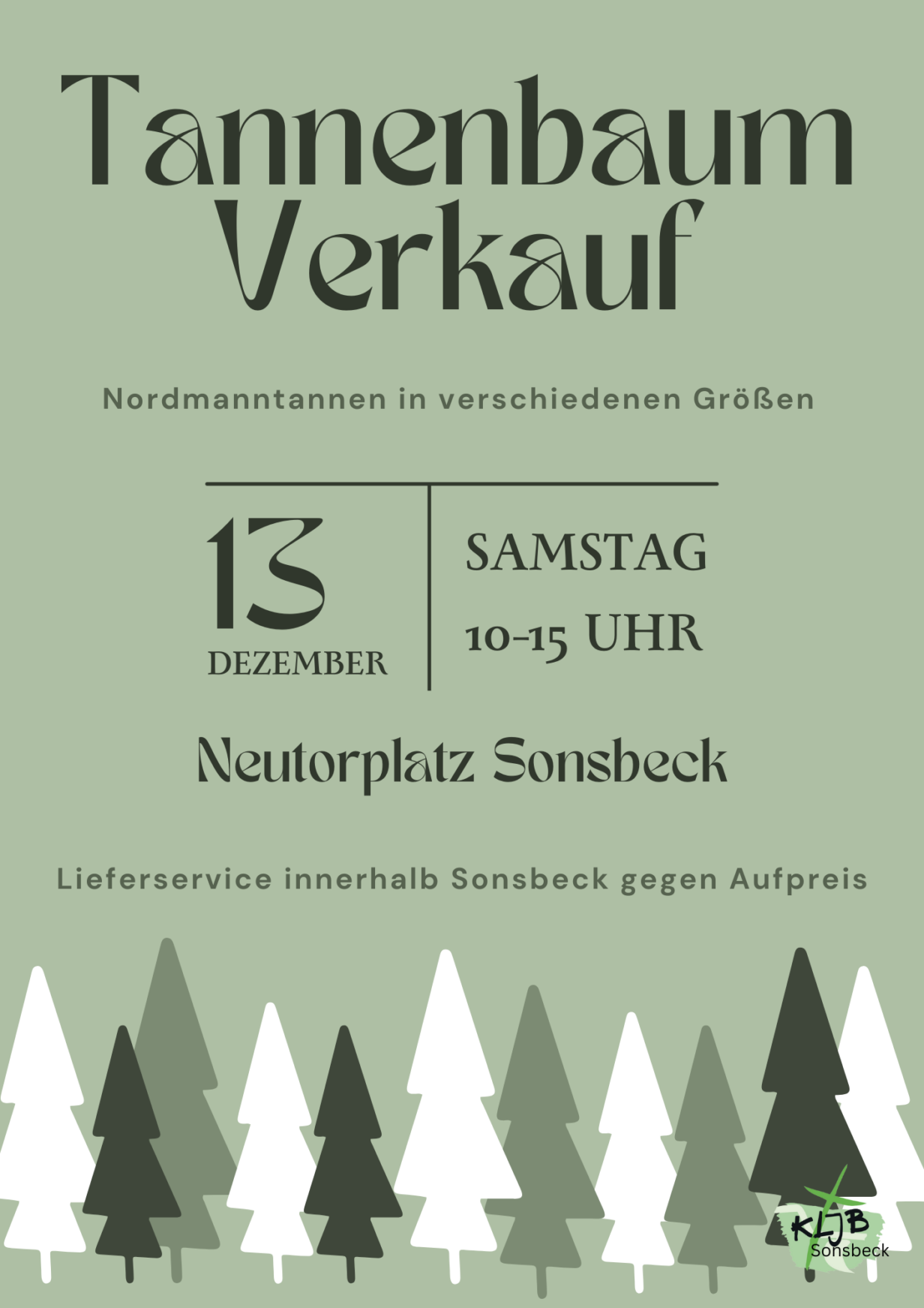 Die Katholische Landjugendbewegung (KLJB) Sonsbeck verkauft auch in diesem Jahr wieder Tannenbäume. Stattfinden wird diese Aktion in vorweihnachtlicher Atmosphäre am Samstag, den 13.12.2025, von 10-15 Uhr auf dem Neutorplatz in Sonsbeck. Angeboten werden Nordmanntannen in vier verschiedenen Größen. Gegen einen kleinen Aufpreis bieten die KLJB’ler an, die Tannenbäume innerhalb von Sonsbeck nach Hause zu bringen.
